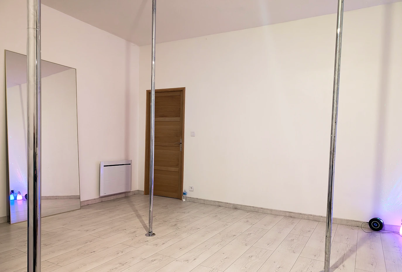Je vous accueille dans un espace avec une belle hauteur sous plafond dédié à la pole dance. Cette pièce dispose de 3 barres dont 1 podium. Tout le matériel est de la marque X-pole.